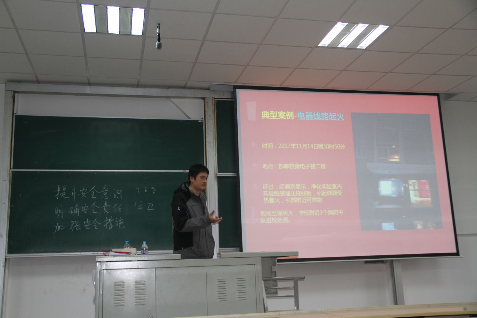 复旦大学保卫处安全办主任刘建生给全体教工作安全教育培训,刘主任通报近期上海市和学校的火情并通过实验案例讲解逃生自救措施,用灭火器现场演示讲解救火方法。