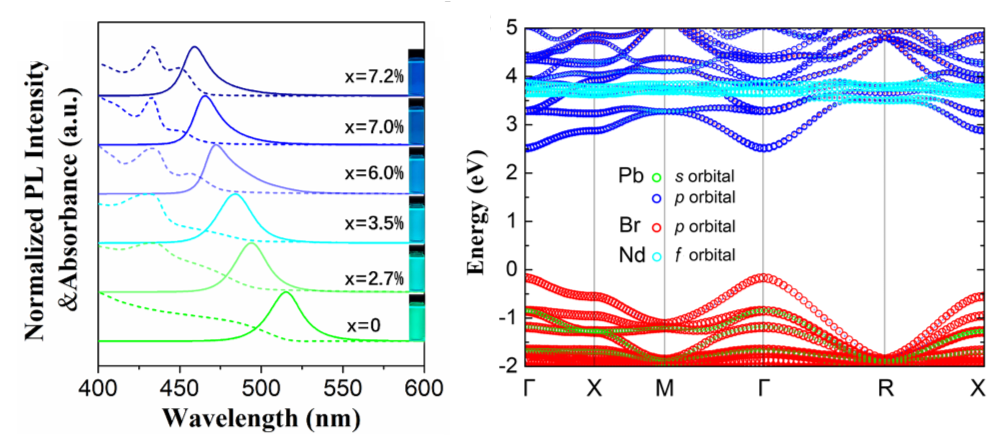 图1 不同钕离子掺杂比例下CsPbBr3纳米晶的荧光发射光谱和吸收光谱,以及掺杂后的能带结构