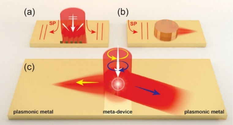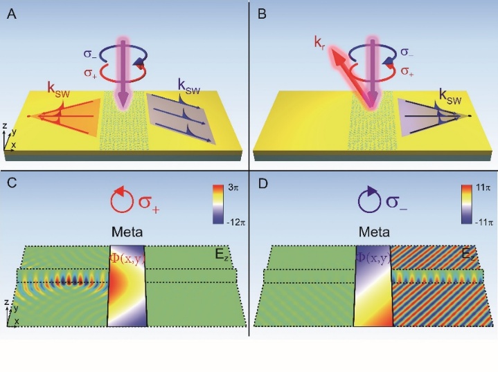 表面波(包括表面等离激元、人工表面等离激元)是一种局域在金属等材料表界面的电磁本征模式,所携带的水平波矢分量大于真空中电磁波的总波矢,具有亚波长分辨和局域近场增强等奇异光学性质。表面波的相关研究一直是纳米光子学领域的研究热点,在增强光学透射、超分辨成像、光学通讯、增强光学吸收、化学/生物传感等方面具有重要的应用价值。为了实现以上应用目标,不仅需要高效率激发表面波,而且希望能够有效调控表面波的光场形貌。为此,人们曾提出利用棱镜、光栅等耦合器实现表面波的激发,另外也提出引入传统光学器件来调控表面波的波前分布,然而实现这两种功能不仅需要不同的光学器件,而且通常存在体系尺寸大、效率低、功能单一、不易集成等问题。