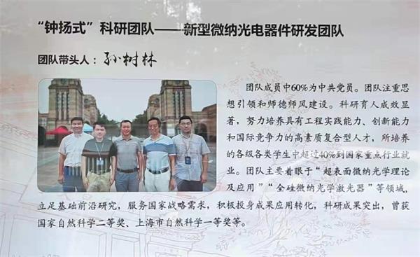 新型微纳光电器件研发团队主要成员为光科学与工程系孙树林、陆明、王松有、吴翔、张树宇等,成员中60%为中共党员,团队注重思想引领和师德师风建设,科研育人成效显著,所培养的学生中超过40%到国家重点行业就业。团队主要着眼于“超表面微纳光学理论及应用”“全硅微纳光学激光器”等领域,立足基础前沿研究,服务国家战略需求,积极投身成果应用转化,科研成果突出,曾获国家自然科学二等奖、上海市自然科学一等奖等。