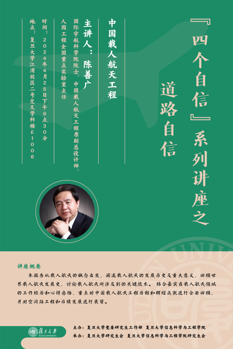 4月25日晚,由复旦大学党委研究生工作部、复旦大学信息科学与工程学院主办,复旦大学研究生会、复旦大学信息科学与工程学院研究生会承办的“相辉讲堂”之道路自信系列活动在复旦大学江湾校区交叉二号楼E1006顺利举办。陈善广老师以“中国载人航天工程”为主题,带领同学们对中国载人航天工程历程和辉煌成就进行全面回顾,并对空间站工程和后续发展进行展望。