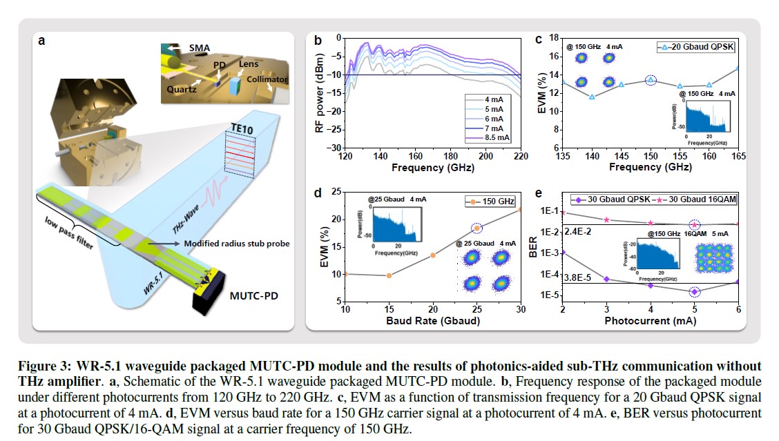 在本项研究中,展示了一种基于磷化铟(InP)的波导集成改进型单行载流子光电二极管(MUTC-PD)。通过对载流子输运、光耦合效率以及波导结构的精心优化(模式场匹配器、优化电场分布、平衡载流子传输并最小化寄生电容),成功解决了光电探测领域长期存在的带宽-效率权衡瓶颈问题,最终实现了3 dB带宽206 GHz和0.81 A/W外部响应度的倏逝耦合波导光电探测器,带宽效率积(BEP)超过130 GHz,树立了光电探测领域BEP指标的新标杆。器件采用WR-5.1波导输出,在127–185 GHz频率范围内提供超过-5 dBm的射频输出功率。同时作为概念性验证,基于光子辅助的通信架构,利用研制的MUTC-PD在没有任何太赫兹放大器的情况下,实现了室内54米最高速率可达120 Gbps的无线传输演示。这项工作为显著提高光功率预算和降低能耗开辟了一条途径,是迈向高带宽、高效率太赫兹通信系统和下一代无线网络的变革性一步。